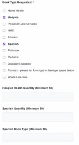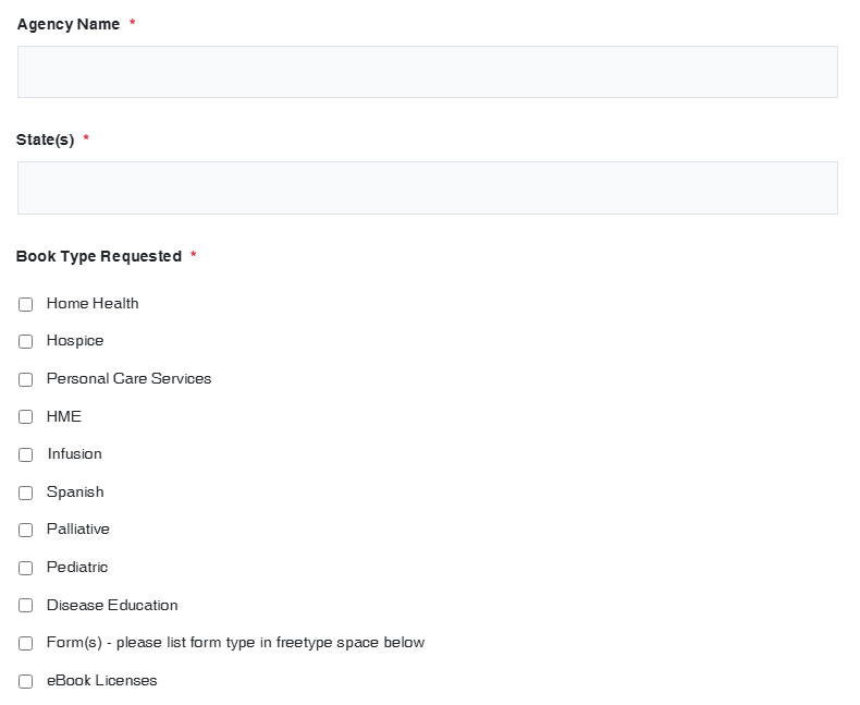 After making your selection, you will need to provide us with your company’s information. This helps ensure we find your last printing. If you have multiple locations, please specify which location you are ordering for in the agency name space. If you are unsure what book type your company uses, most are listed on your previous booklet’s cover or table of contents. Agency information is a required field and if it is not filled in, your reorder will not be submitted.