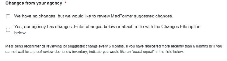 After you provide your agency details, we will need to know if you are wanting to go through the reorder process or if you are needing an exact repeat (a reprinting of your last approval). In order to ensure your company’s compliance on a Federal, State and Accreditation level, we recommend ordering every 6 months with the intention of receiving updates. Changes information is a required field and if it is not filled in, your reorder will not be submitted.
