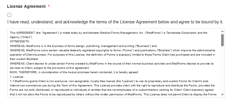 We will then ask you to please check the box for having read your license agreement. This helps ensure your agreement is updated regularly. A copy of this agreement is sent to you with your order confirmation for your records. License Agreement acknowledgment is a required field and if it is not filled in, your reorder will not be submitted.